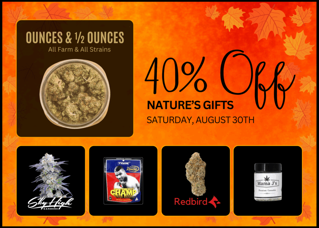 Are you looking for the highest quality cannabis and best prices around? Nature’s Gifts in Sequim consistently offers flower, pre-rolls, concentrates, and edibles from the finest Washington growers at the lowest prices on the Olympic Peninsula. And, this Saturday, August 30th is the perfect time to stock up on flower or try something new. All weed ounces and half ounces will be on sale at 40% off – all farms and all strains. You can also get similar discounts on products from the following five outstanding brands: